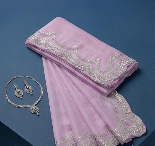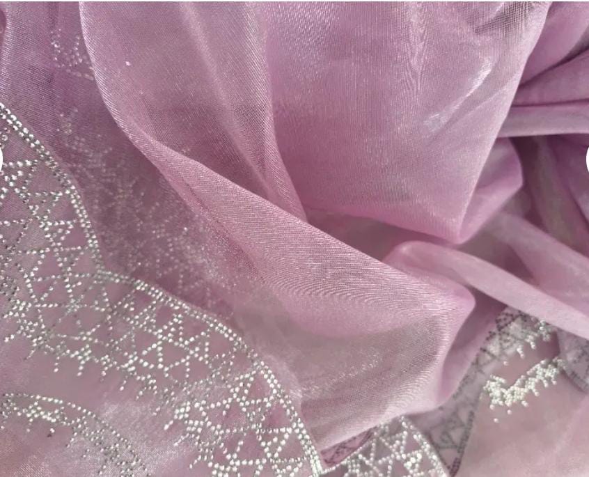 Flowing organza draped in a pastel lavender shade, enhanced with a lustrous silver scallop trim for a refined finish. A graceful pick for festive moments, special events, and elegant daytime wear.