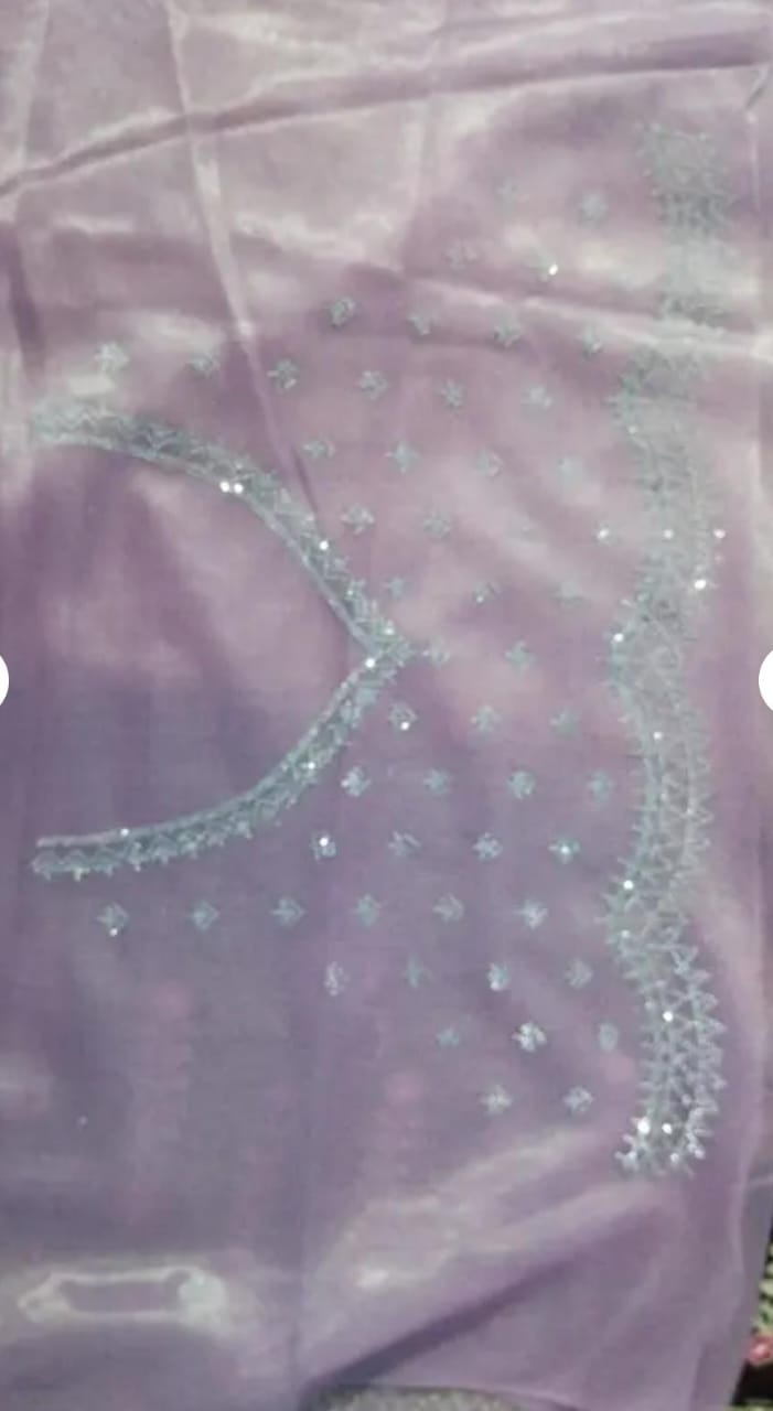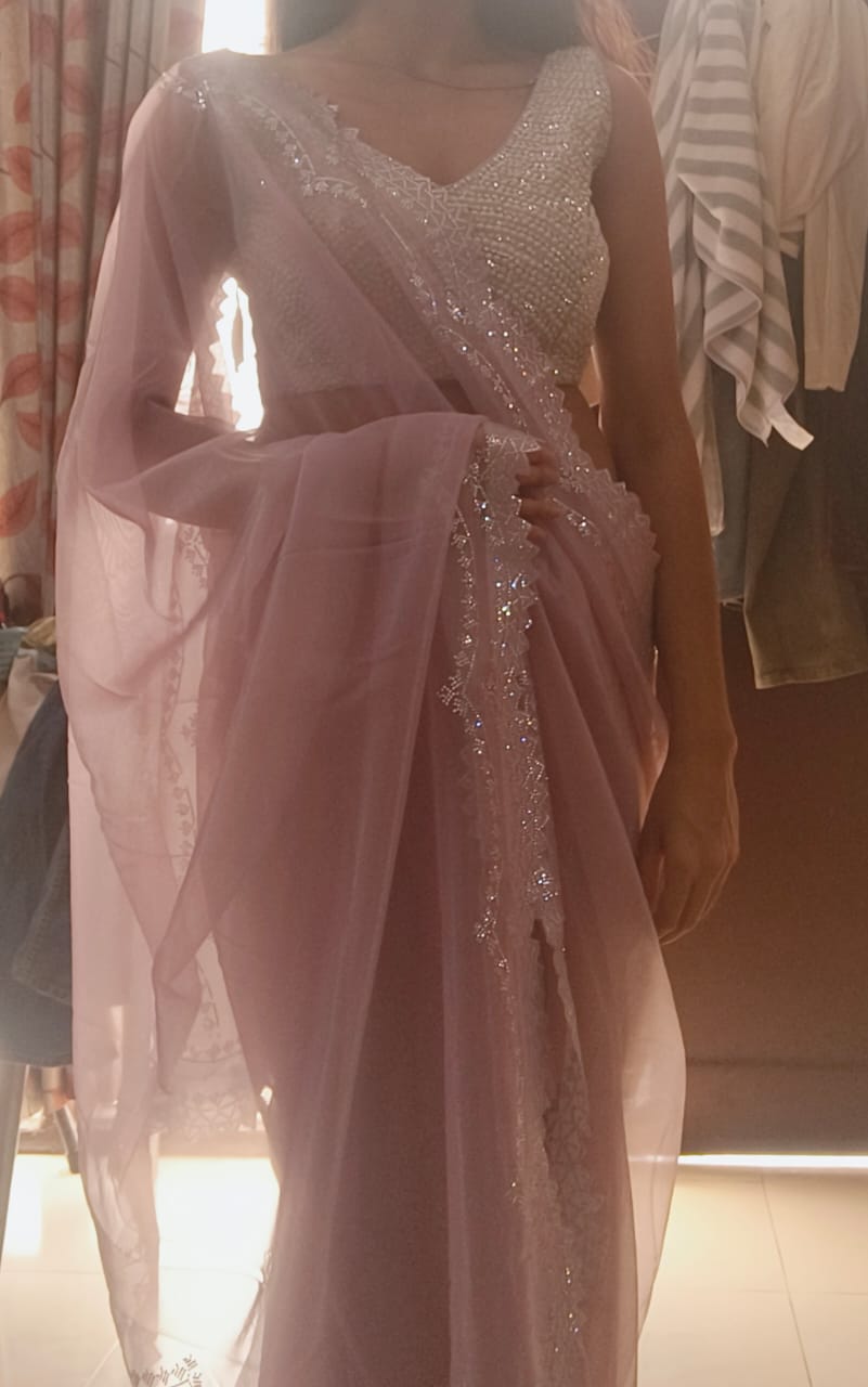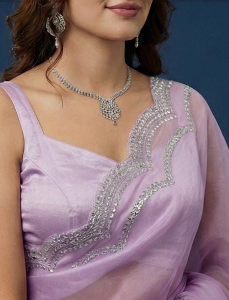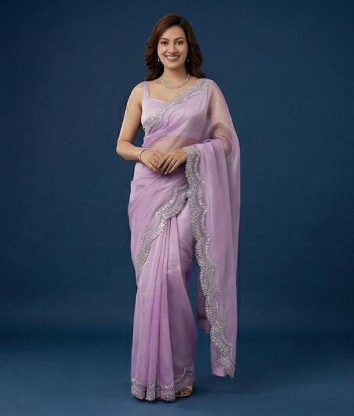 Crafted from airy, translucent organza, this saree features a soothing lavender tone highlighted by a radiant silver scalloped edging. Its refined charm makes it a beautiful choice for celebrations, social gatherings, and polished daytime looks.