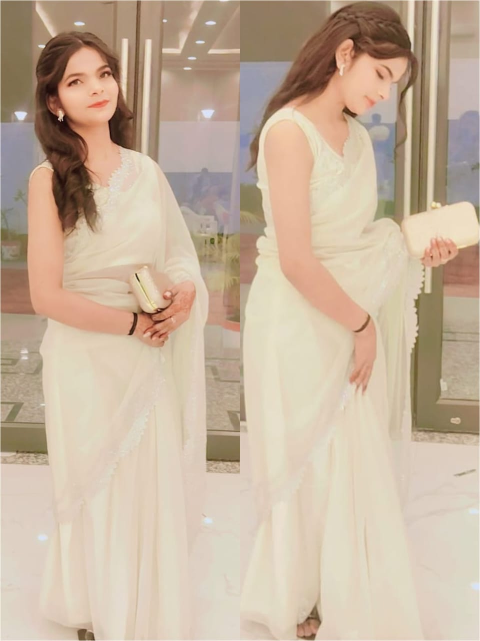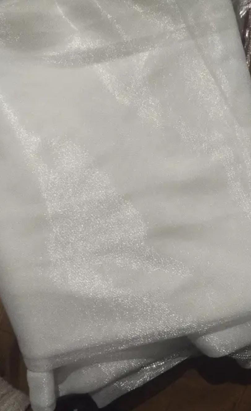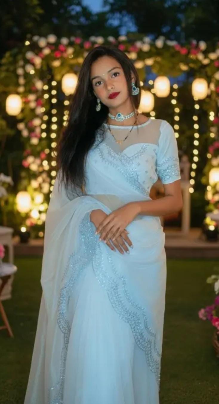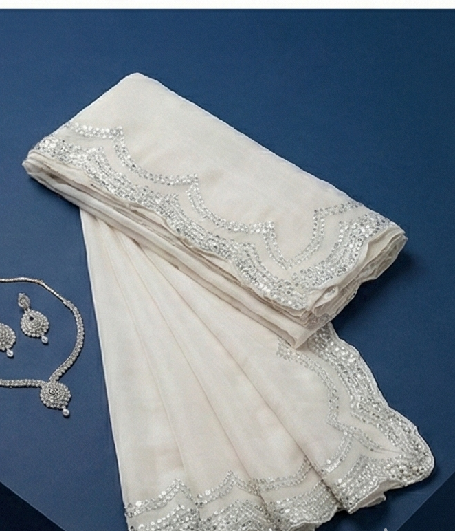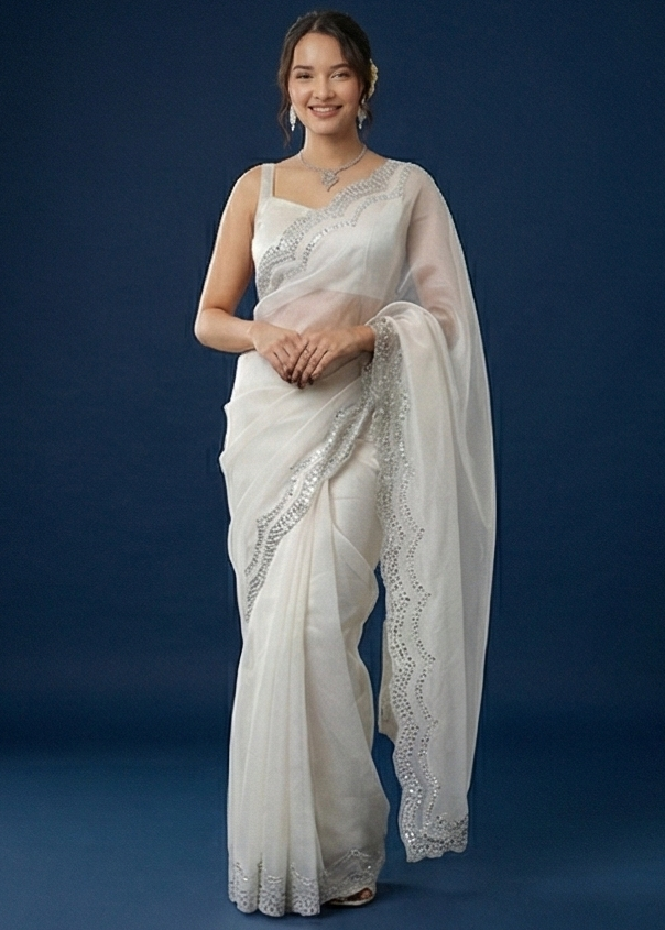 Flowing organza draped in a pastel white shade, enhanced with a lustrous silver scallop trim for a refined finish. A graceful pick for festive moments, special events, and elegant daytime wear.