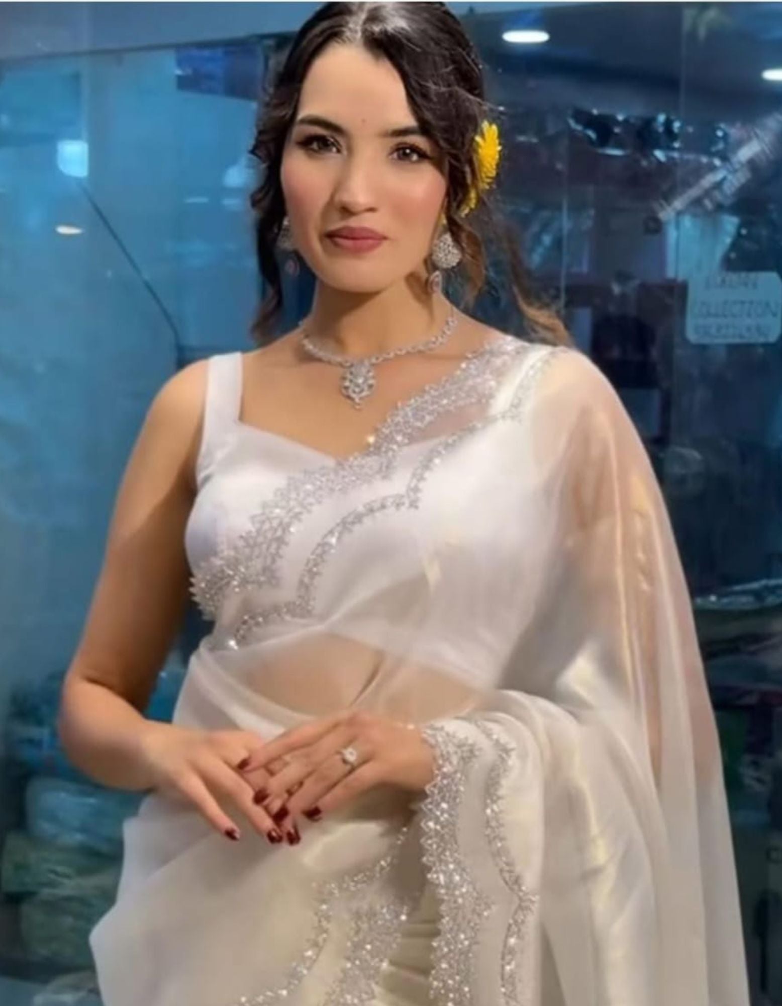 This ethereal organza saree showcases a soft white palette paired with a gleaming silver scalloped border, creating a timeless look suited for celebrations, soirΓ©es, and chic day occasions.
